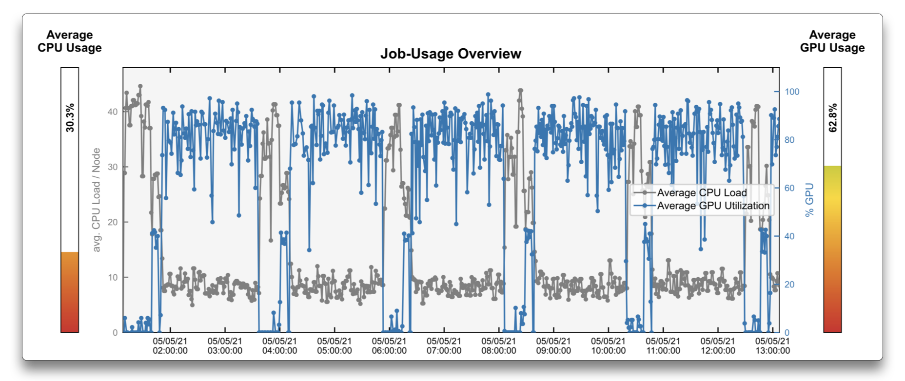 The overview of the job above shows how the workload alternates between CPU and GPU, and where the time is mostly spent. This information can be used to focus performance improvements either on the most time-consuming part or on overlapping calculations, if possible.