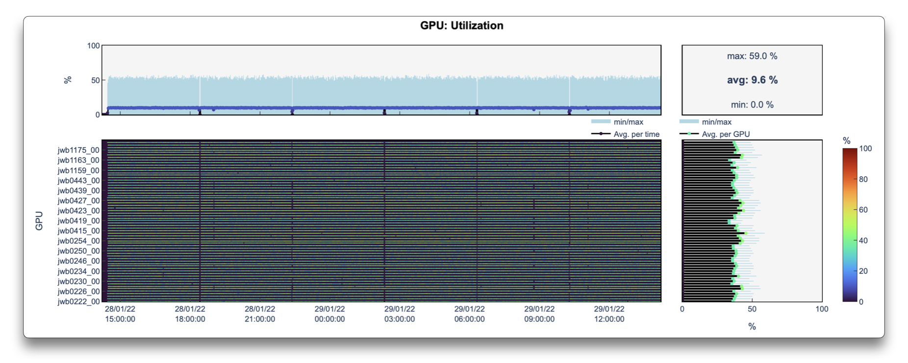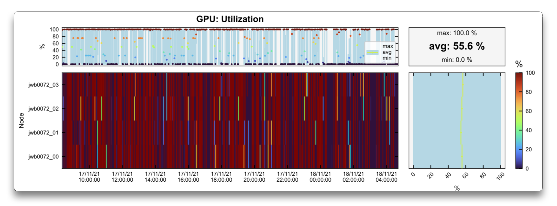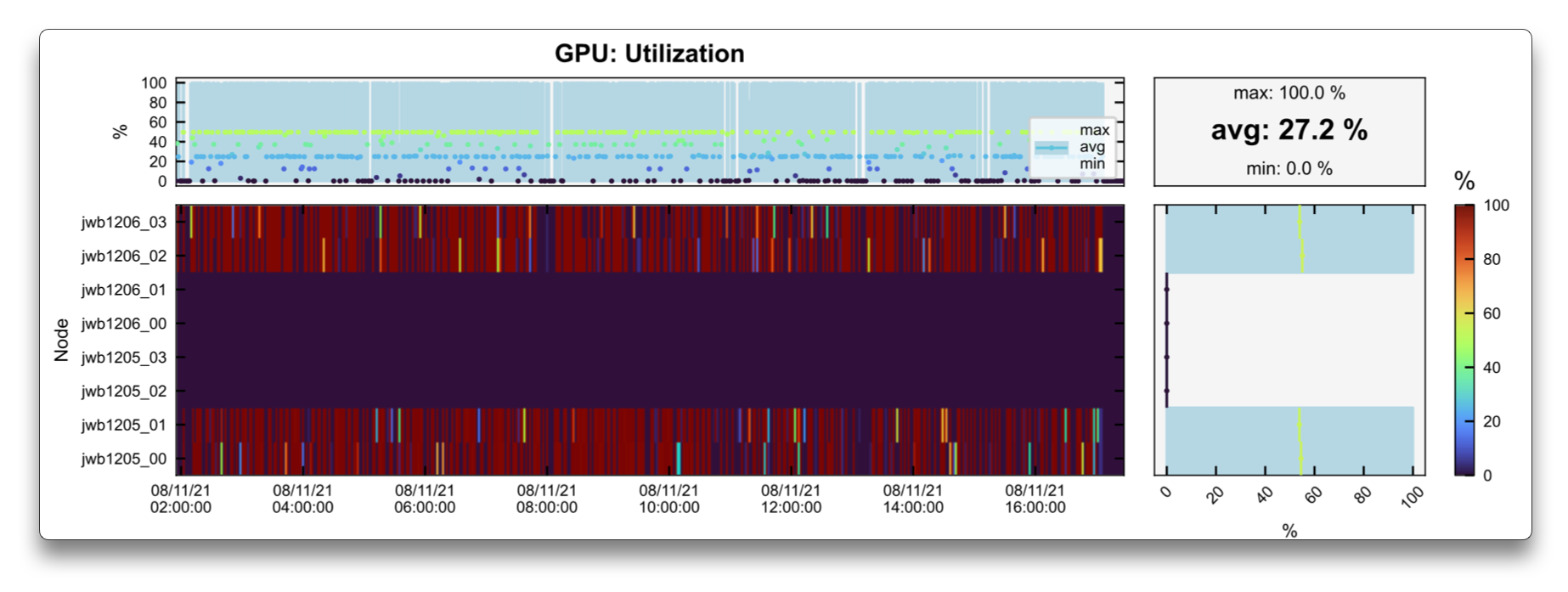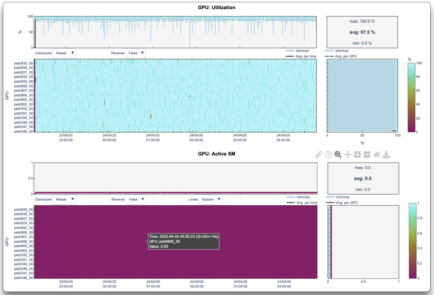Another example of unused GPUs is shown in a smaller job above. In this case, 2 nodes were requested, but only the first two GPU of the first node and last two GPU of the second node were being used-while 4 GPUs were budy, another 4 were idle. After the error has been identified via its job report on LLview, the user was informed and fixed the issue.