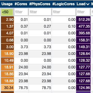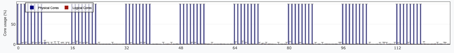 A job that was running with a CPU load close to 256 (the number of possible threads on the compute nodes) but only 50% of CPU usage presented the following distribution per core: