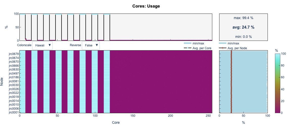 On the HTML report, the distribution of core usage per node was indicated in the following graph: