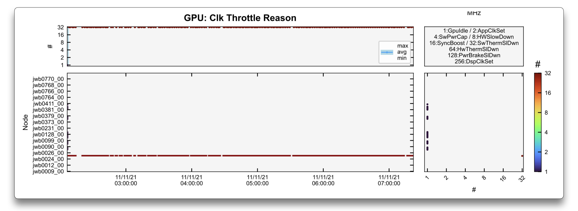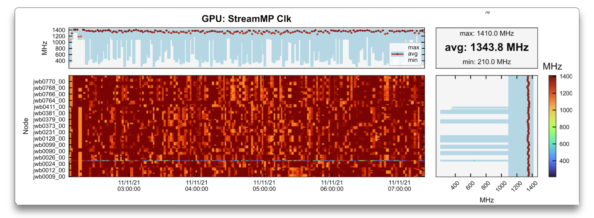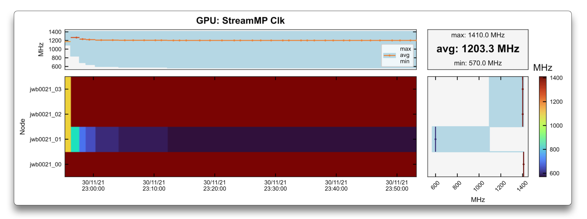 In this case, a single node job used 4 GPUs, and one of them had much slower frequency (as seen in the StreamMP Clk plot) than the others.