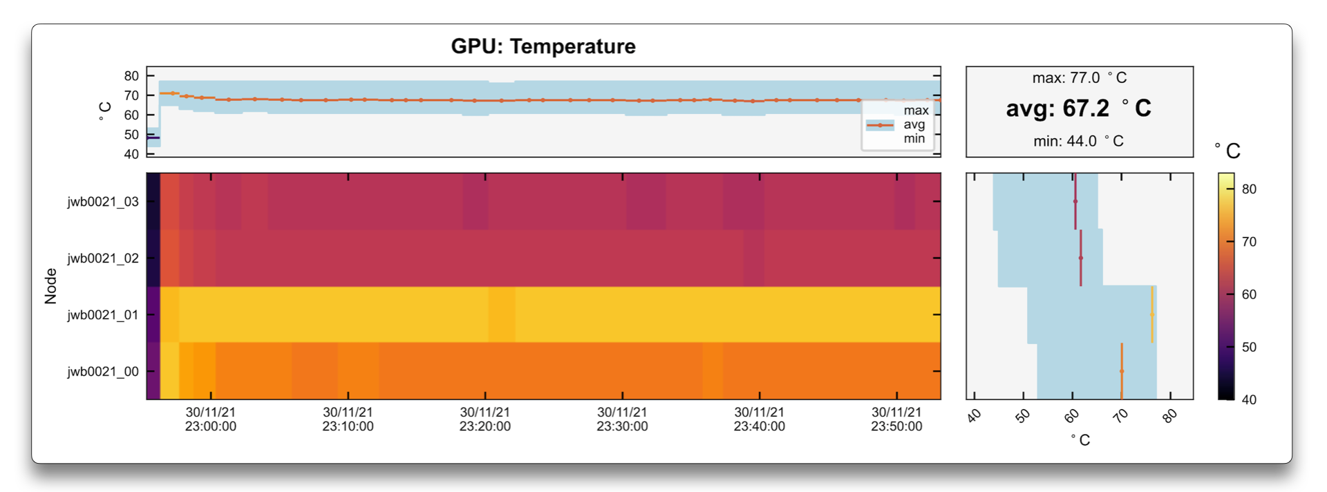 In this second example, it is more obvious that a single GPU in a very large job is much hotter than the others.