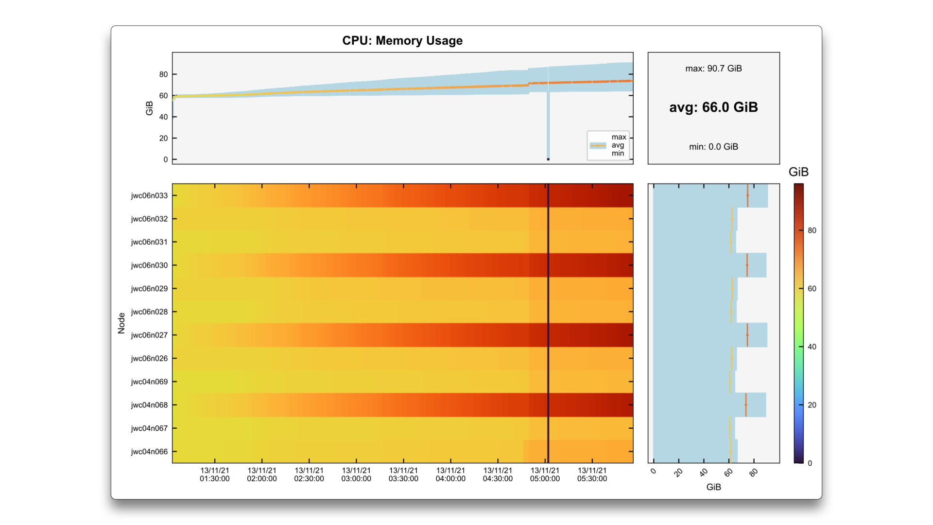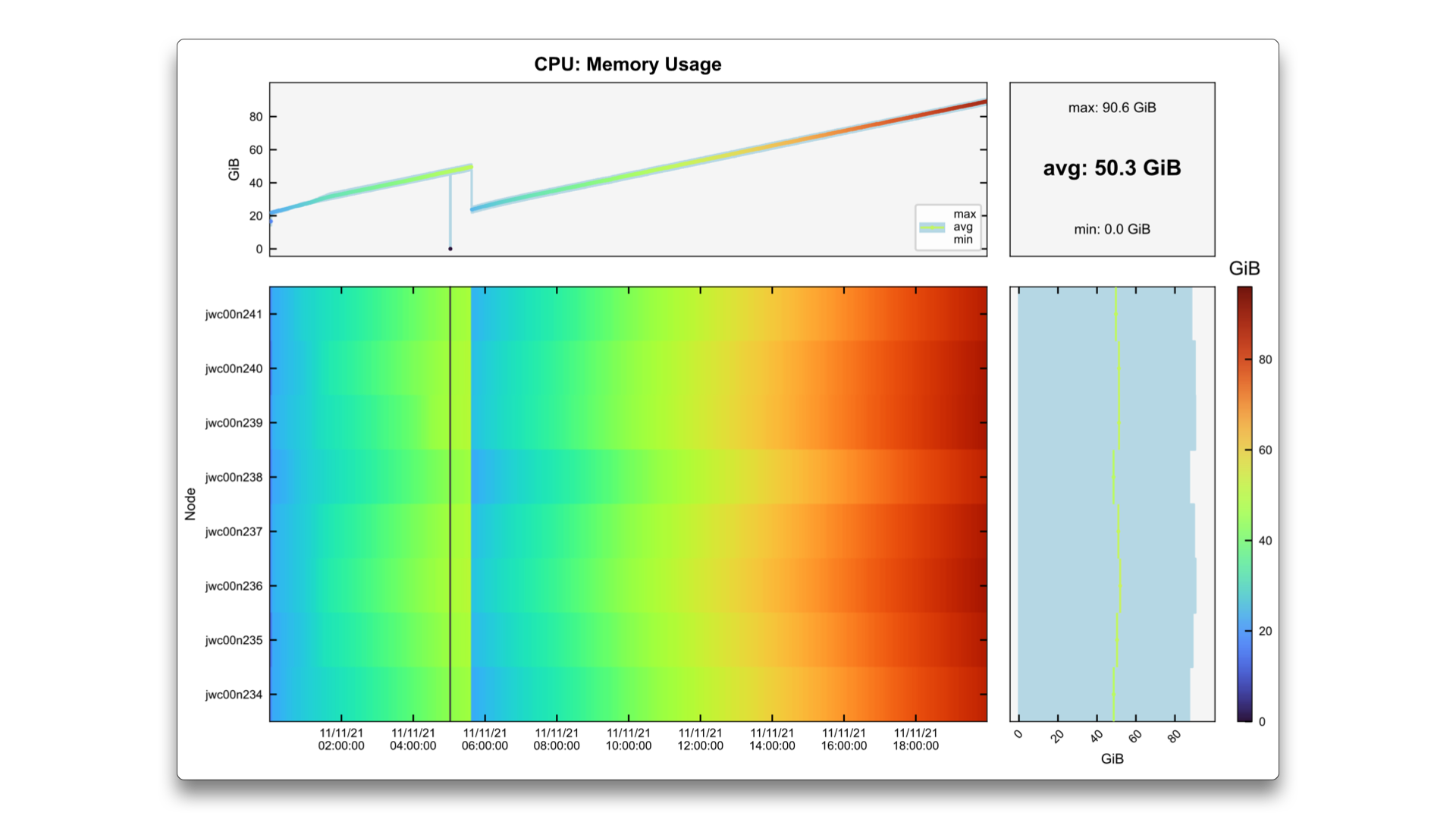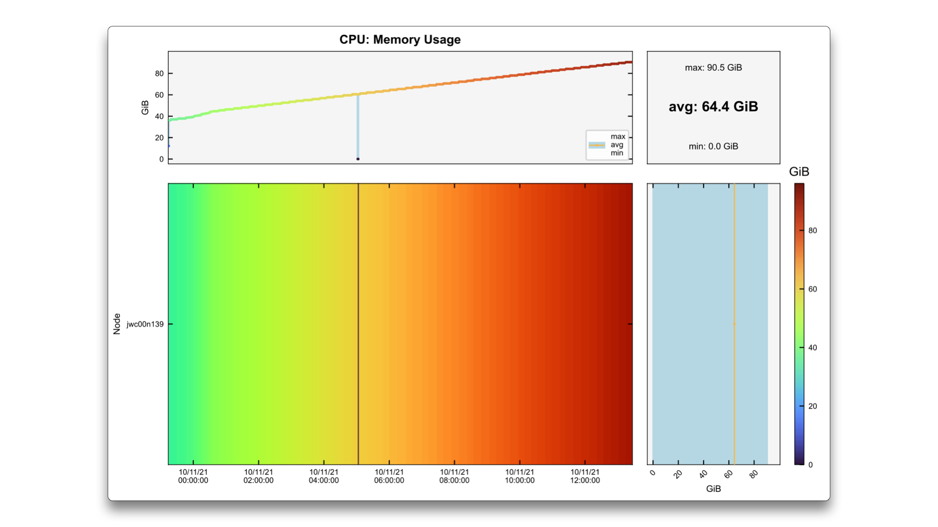 In this second scenario, the job uses 12 nodes, and only every third node display a monotonic memory increase. In the top graph, which is the node-averaged memory usage per time, the average line may not be too high, but the maximum reaches the limit of the system, and the program crashes. As before, this can be a case of unfreed memory on those particular nodes.
