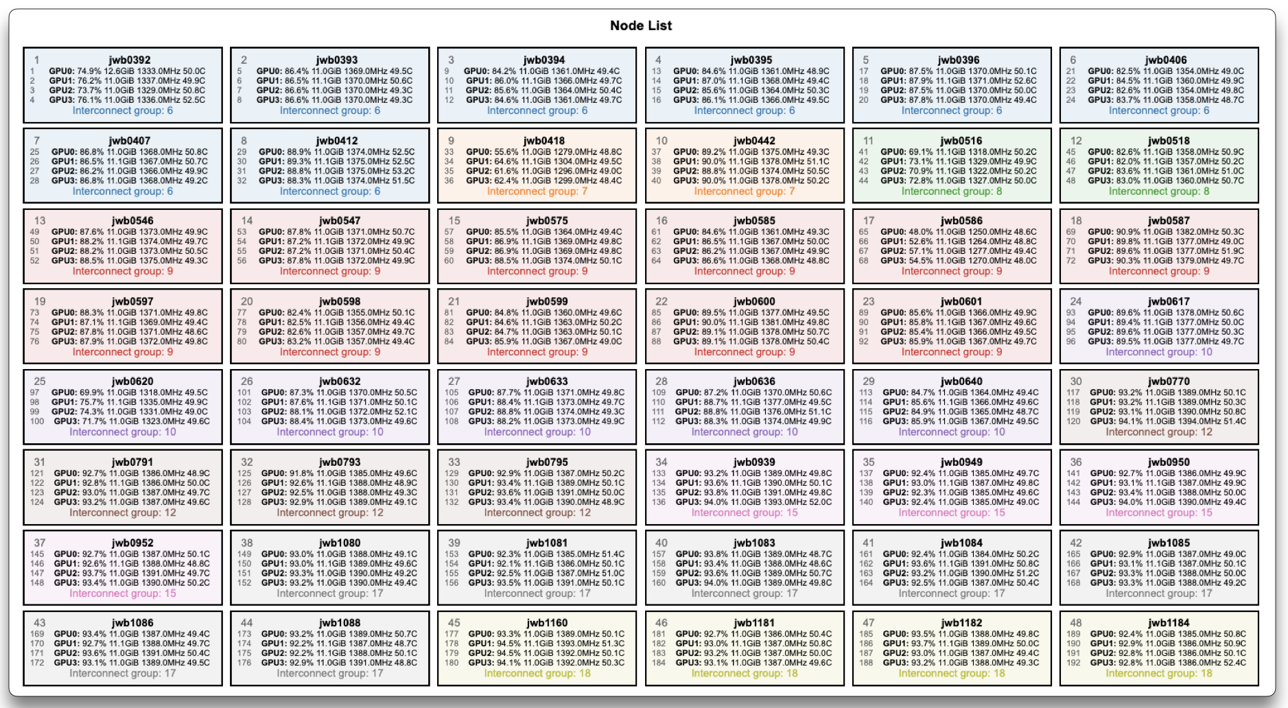 The Node List displays every allocated node as a labelled box, coloured by its interconnect group—a logical grouping that indicates network proximity (nodes sharing a colour are more tightly connected).