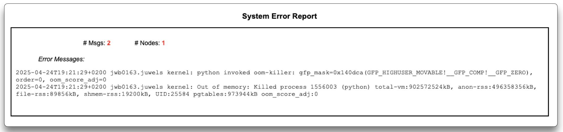 At the end of each detailed report, LLview lists System Errors detected during your job run (when that is the case). These include errors emitted from the system side, which users usually do not have access to.