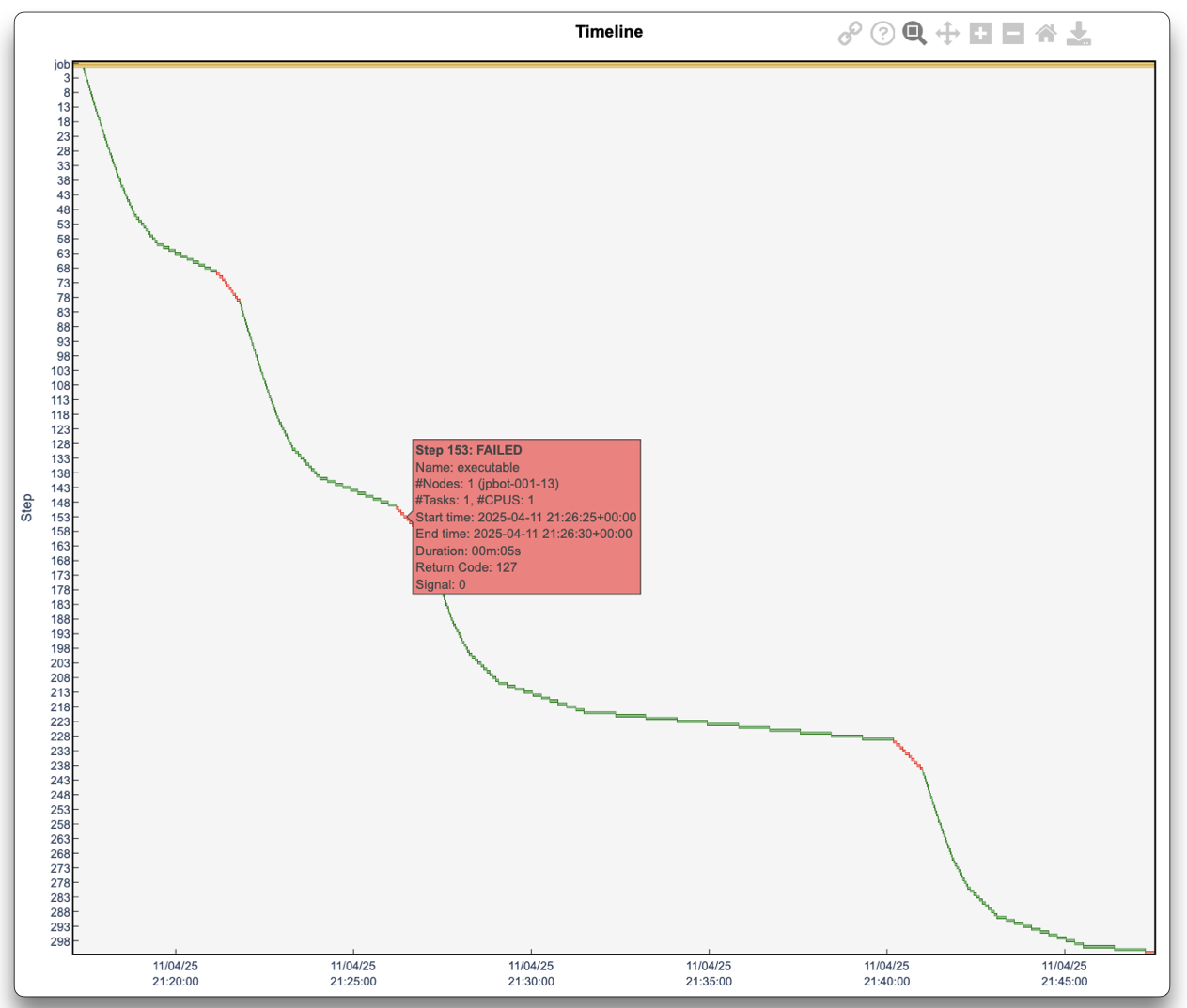 - Hover for details: job/step name, status, nodes, tasks, CPUs, start/end times, duration, return code, signal.