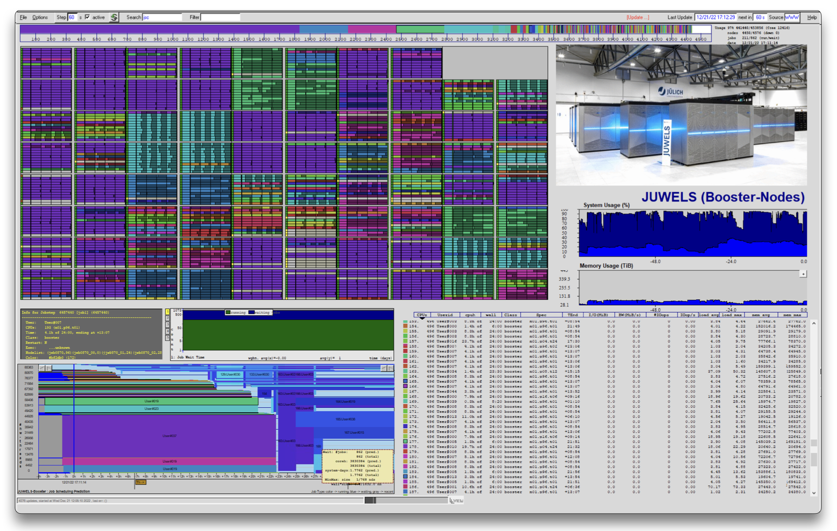 The interactive client is a stand-alone application that can run on any Linux/Windows/MacOS system and shows the current state of the monitored system. It includes a color-coded list of the running jobs and their distribution along with the racks and nodes, as well as a visual representation of the queue state. The job list and the system distribution are linked together, and the identification can be seen by hovering the mouse pointer over one of them. Monitoring data is accessed by HTTPS from LLview web server providing LML files (more details about this data format below). Currently, the batch mode of the client is used to generate SVG files representing a live view of the system, which is then embedded into the job reporting web portal via the Live tab.